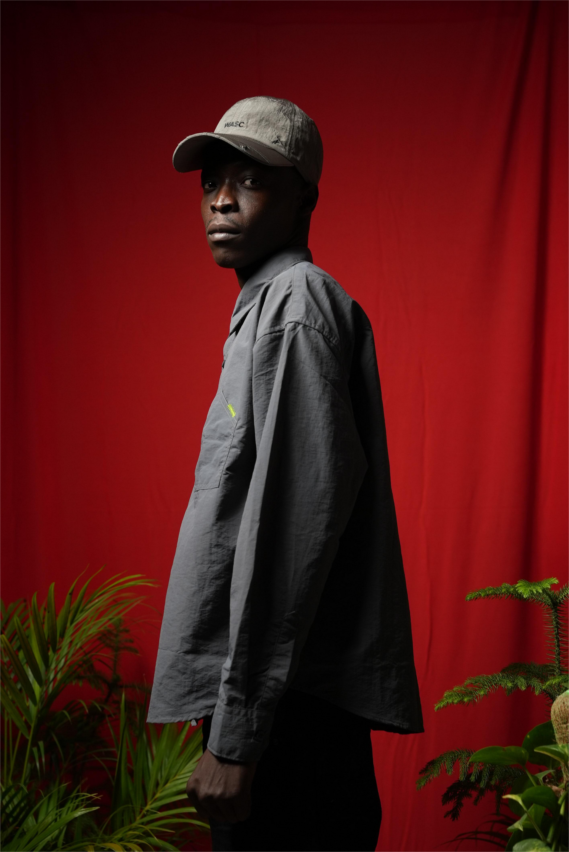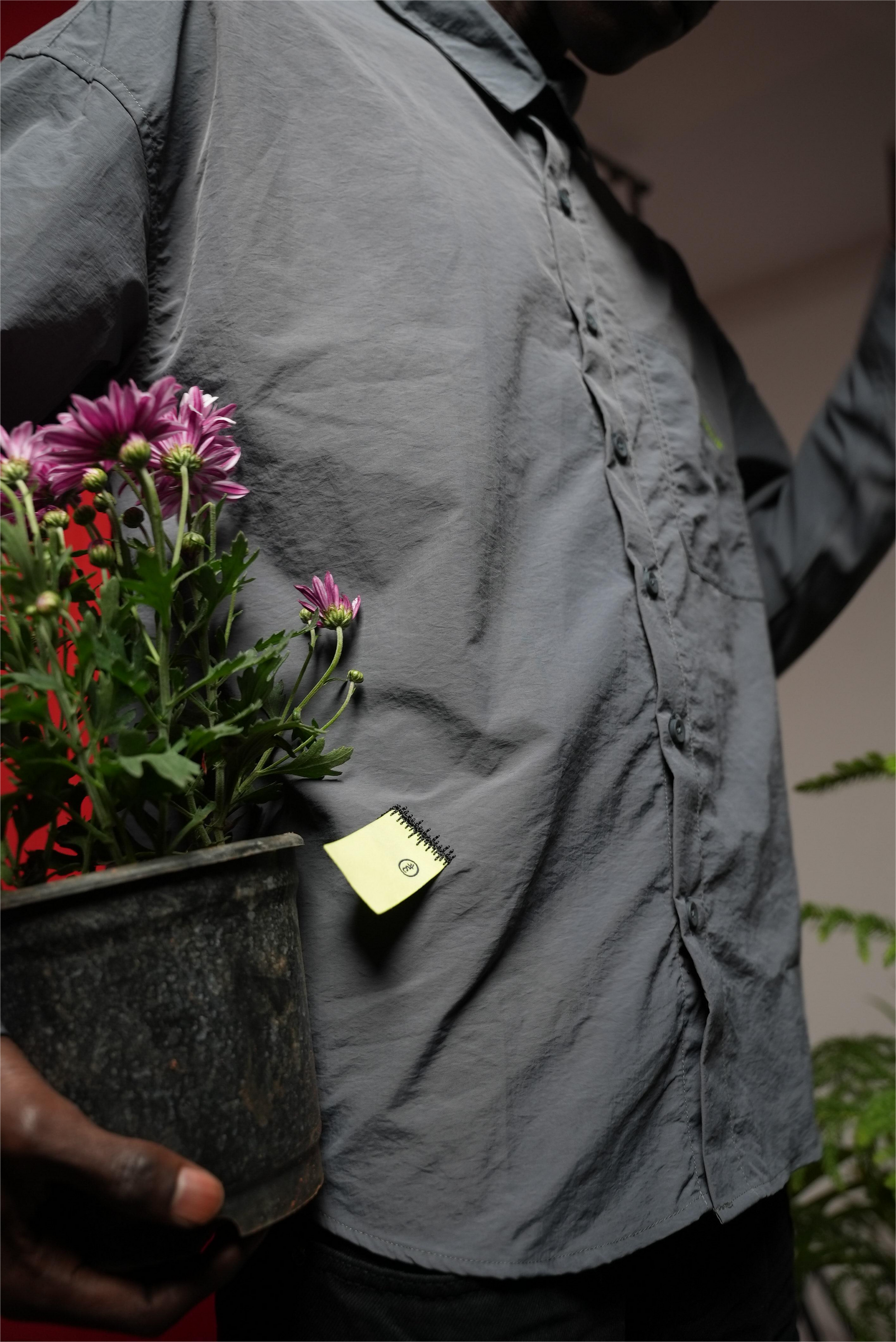 The LABEL EMBROIDERED SHIRT features a durable grey nylon fabric, ensuring long-lasting wear. Its relaxed fit enhances comfort, while the contrast fluorescent green label and pocket embroidery provide a distinctive aesthetic. The irregular stitching adds a unique touch, combining style with functional design for versatile use.
