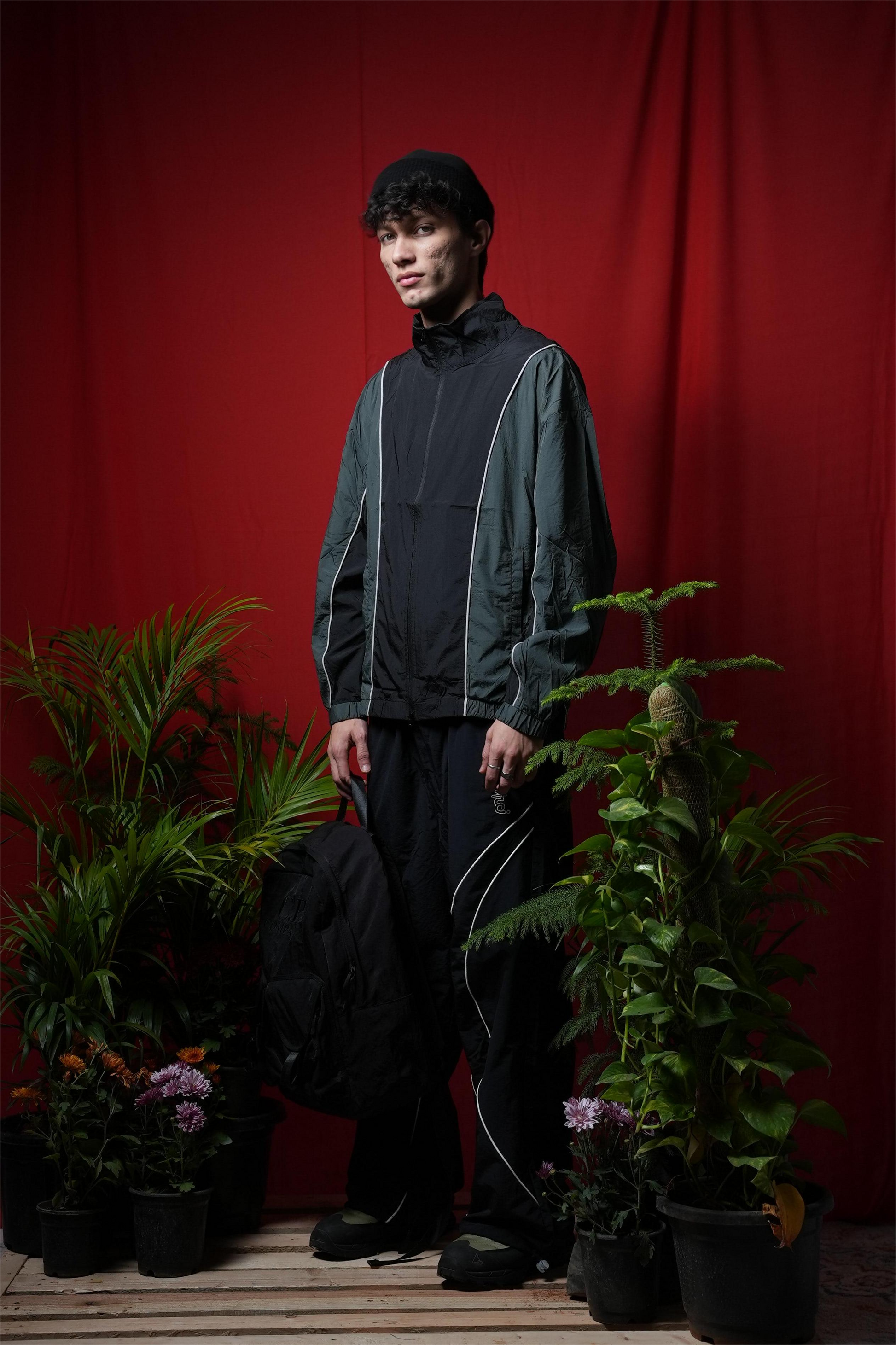 The Technical Windbreaker is designed with a loose fit and crafted from durable nylon, providing comfort and ease of movement. Its high collar zipper and dropped shoulders enhance protection against wind, while elastic cuffs and hem ensure a secure fit. This unlined jacket is ideal for transitional weather, offering lightweight layering options.