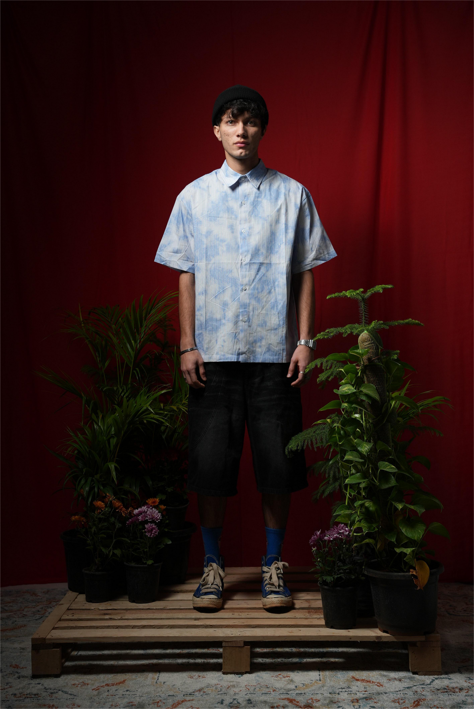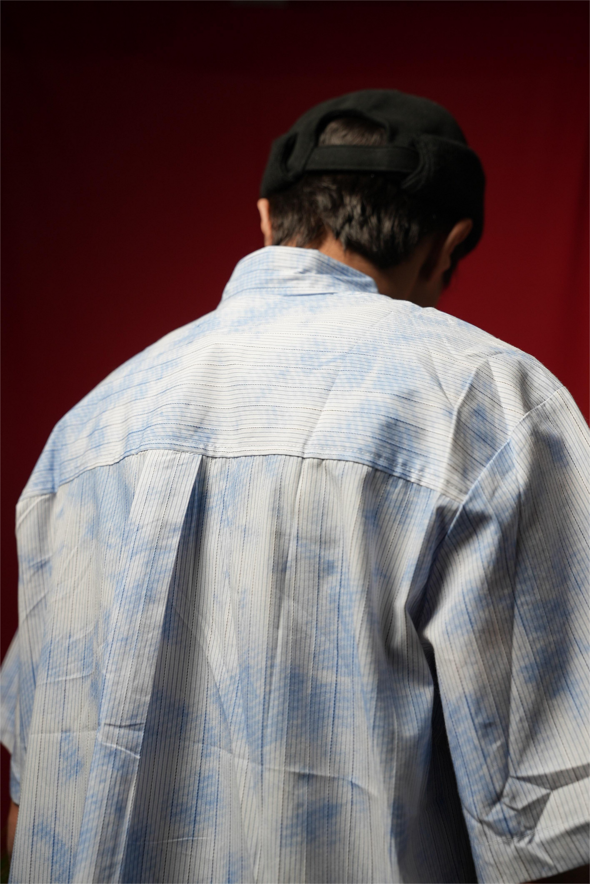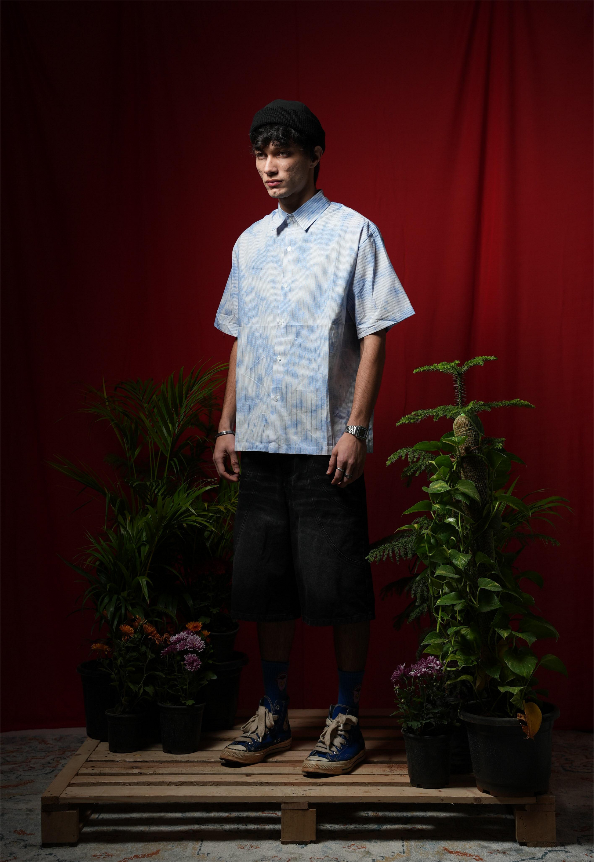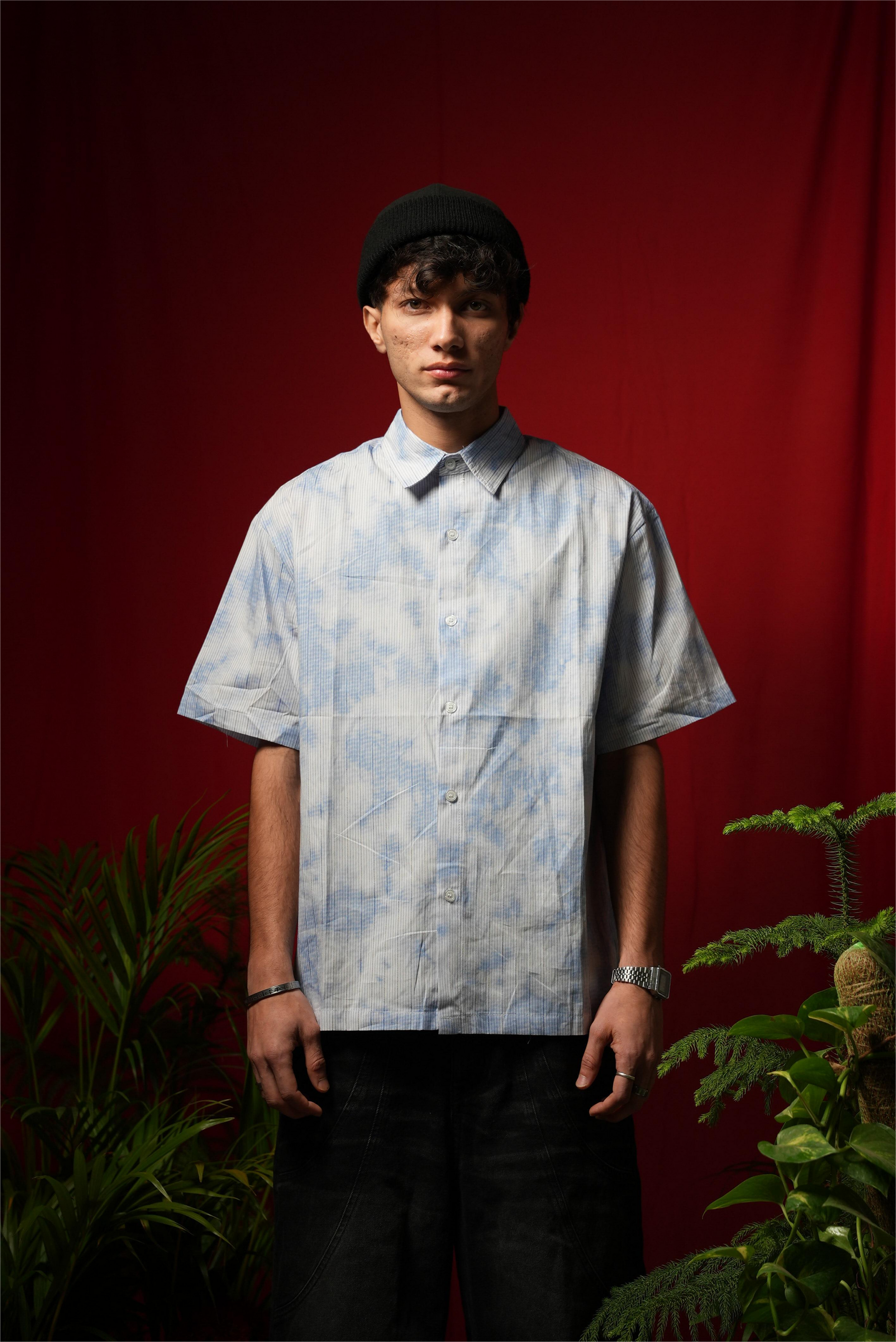 The Striped Sky Printed Shirt features a distinctive stripe design complemented by a sky print, enhancing visual appeal. The pleats on the back contribute to an oversized fit, allowing for increased airflow and comfort during summer. This imported garment is ideal for achieving a relaxed, stylish look in warm weather.