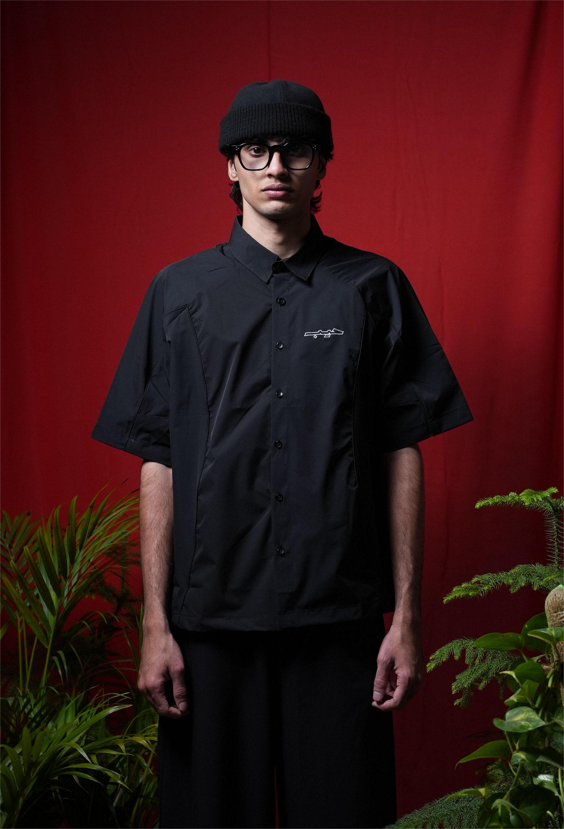 The TECHWEAR 1.0 SHIRT features an oversized fit crafted from durable nylon fabric, providing comfort and flexibility. The black piping adds a refined contrast, while the Arabic logo embroidery enhances cultural aesthetics. This shirt is ideal for those seeking a blend of style and practicality in everyday wear.